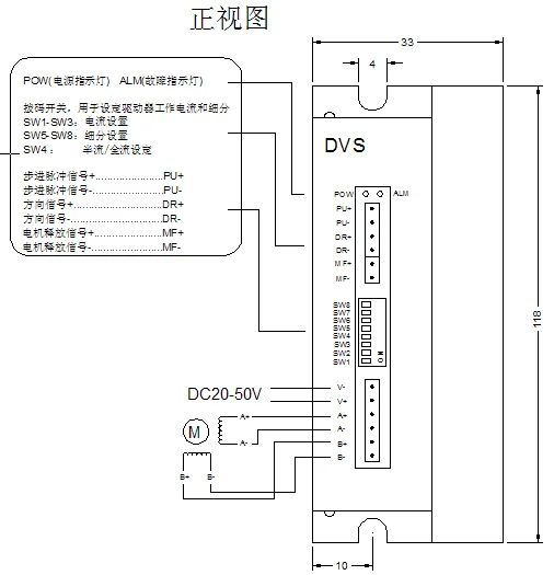 4 | DR- | DP9=OFF, DR is the direction signal | Change the direction of rotation of the motor. The input resistance is 220Ω. Low voltage 0-0.5V, high voltage 4-5V, pulse width>2.5μS | |