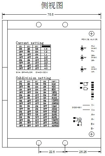 Subdivision (microstep) is set by DIP switches D5~D8, 16 channels in total. D9 and D10 are used to set the drive function.