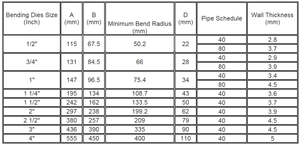 model | greatest pressure | Maximum stroke | Bending die | Tube wall thickness |