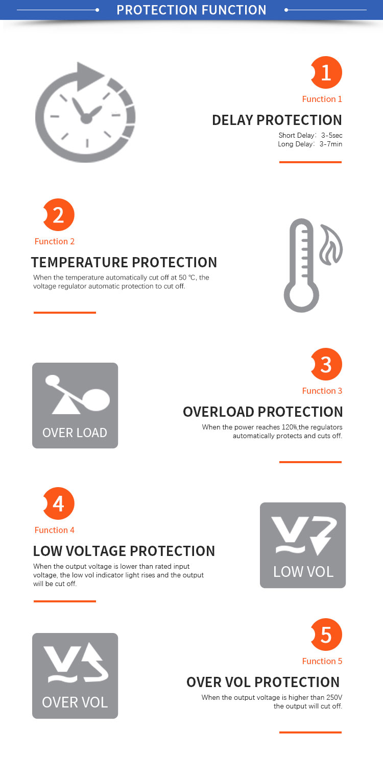 Digital Display | Display input and output voltage, Over\Low Voltage, Overload, delay, temperature | Display input and output voltage, Over\Low Voltage, Overload, delay, temperature | Display input and output voltage, Over\Low Voltage, Overload, delay, temperature | Display input and output voltage, Over\Low Voltage, Overload, delay, temperature | |||