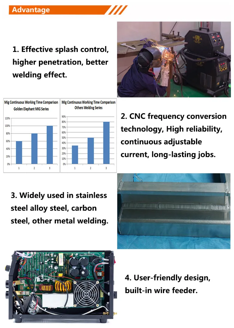 Golden elephant TIG 200/ TIG 250/TIG 315 series welding machines is a new generation of inverter carbon dioxide gas shielded welding machine. Its control circuit has the following characteristics : Anti-interference ,drive circuit design ,high-quality components ,unique design of wire feeding control circuit ,super adaptability ,overall power conversion efficiency is more than 85% under normal use.