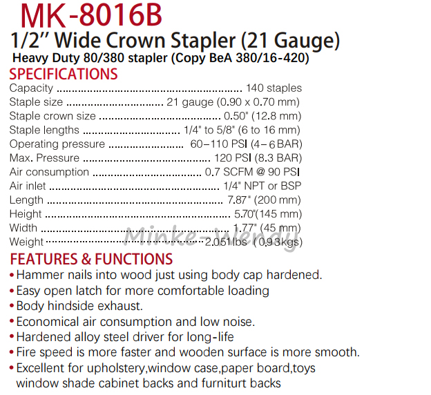| Air inlet: | 1/4" NPT | staple food: | No. 21, length 16-16mm |