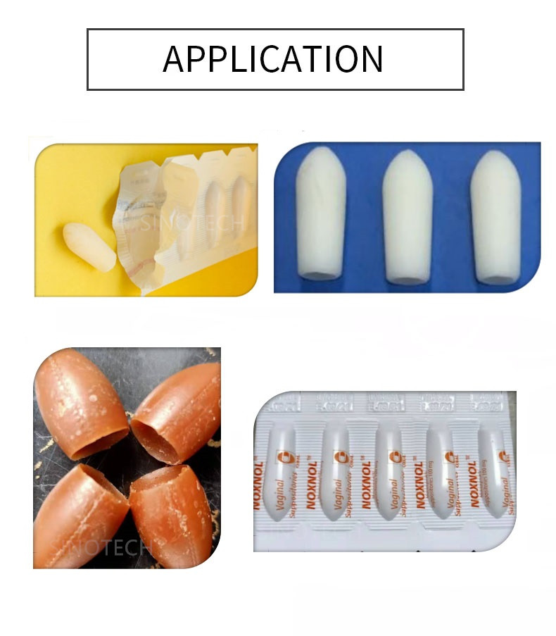 Sinotech-15 fully automatic suppository production line is suitable for the production of special shapes such as bullet head and duckbill, and meets the production of various suppositories. (According to the mold specifications required by customers).