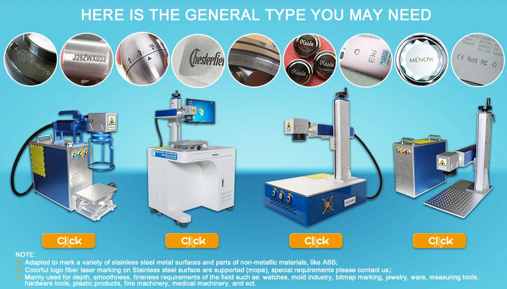 Fiber laser marking machine can work with most metal marking applications Such as Stainless Steel, Brass, Aluminium, Steel, Iron etc, Also can mark on many non metal materials, such as ABS, Nylon, PES, PVC,Makrolon,etc. | |
