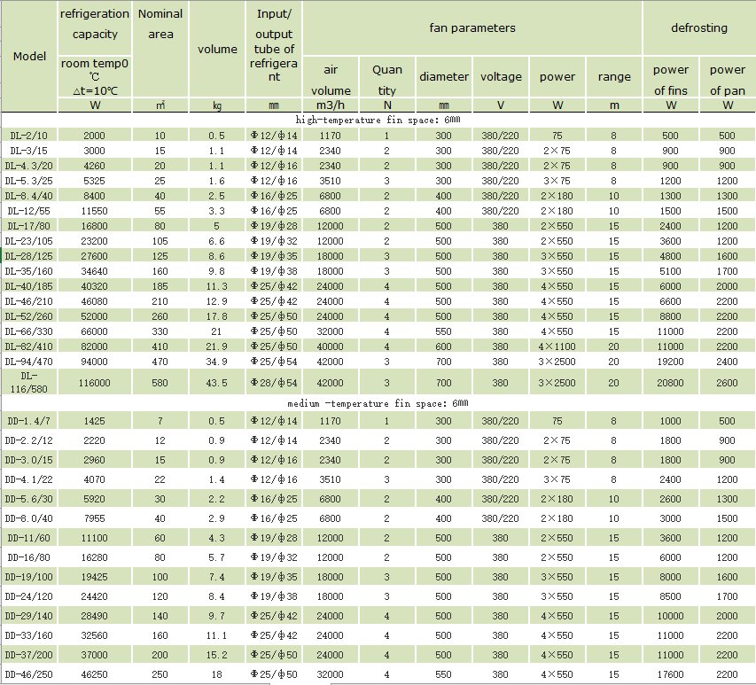 The water defrosting air cooler is a cooling device used in cold storage where electric defrosting cannot be used or rapid defrosting is required. According to the applicable temperature, there are 3 types such as DL, DD and DJ, which are suitable for refrigerated rooms at 0-18 degrees and -25 degrees respectively.