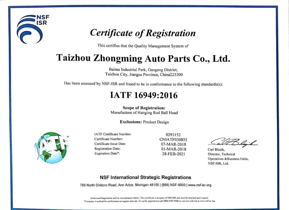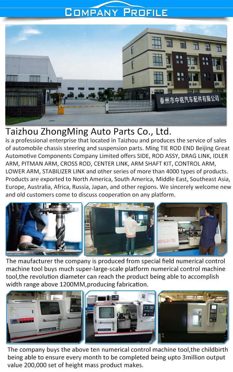 Taizhou Zhong Ming Auto Parts Co., Ltd. is a professional manufacturer of chassis suspension which includes ball head, control arm, steering ball joint, tie rod, stabilizer link, steering assembly, ball joint suspension, modification parts .we have a complete, scientific quality management system and recognized by the industry.