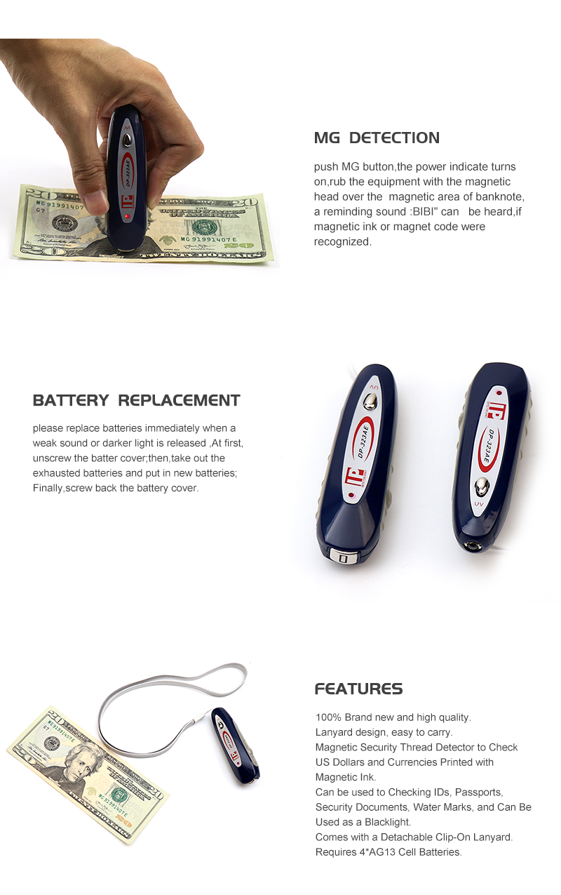 ThisFengjin FJ-07BNot only reveals the UV security features integrated into modern banknotes; it instantly illuminates the UV security features built into today's credit cards, passports and other ID documents, as well as the UV inks used to protect valuables from theft or confirm admission to events .
