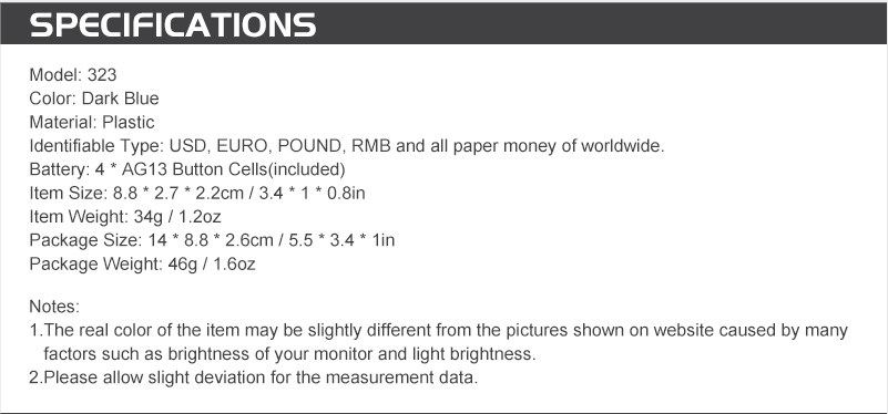 | Packaging Details: | 200pcs in carton | Name: | Cash detector |