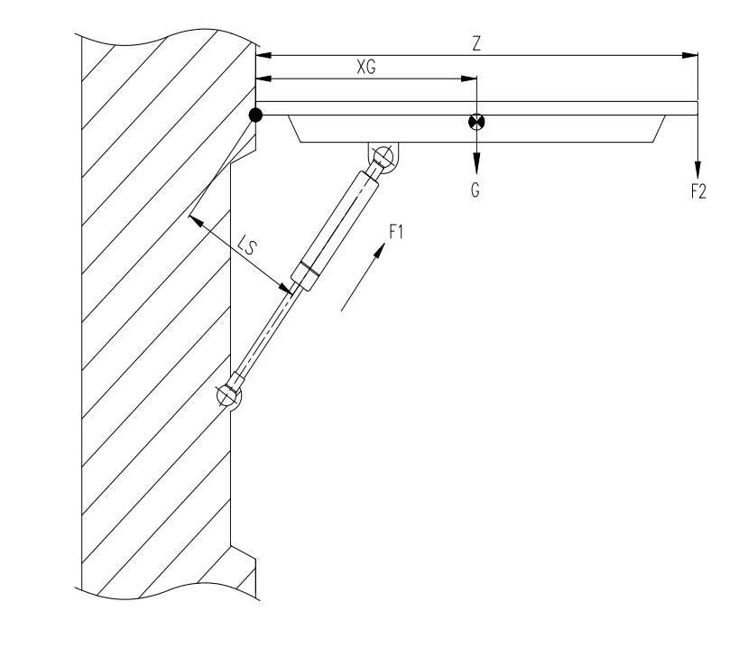 Estimated Gas Spring Force F1 (N) Z = Lid Length from Pivot Point (mm) XG = Center of Gravity (mm) G = Lid Weight in Newtons (kg x 10) LS = Gas Spring Force Radius (mm) A = number of gas springs