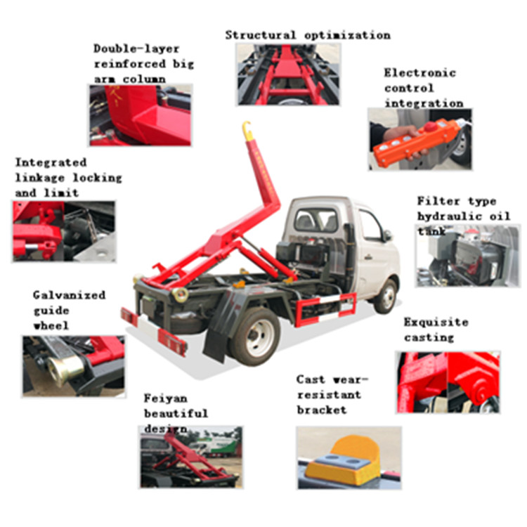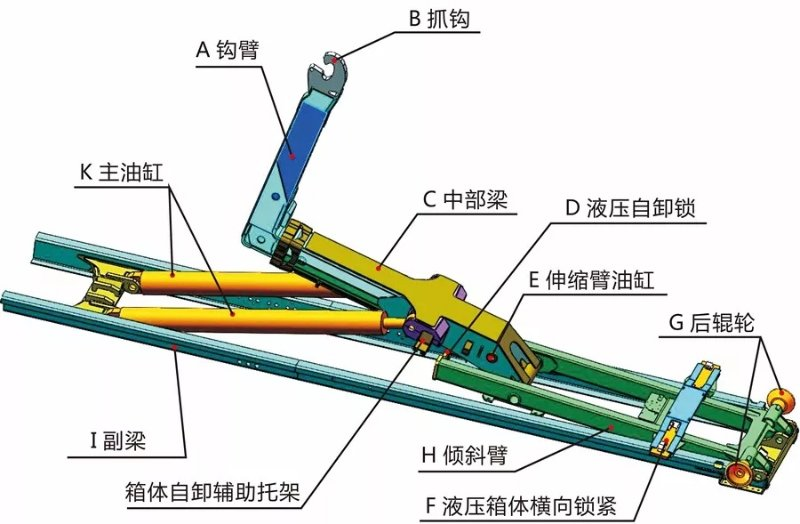 The hook lift is mainly composed of A. Hook arm B. Hook C. Middle frame D. Hydraulic dump lock E. Telescopic cylinder F. Hydraulic tank landscape lock system