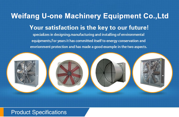 U-ONE series heavy hammer exhaust fan is mainly composed of fan blades, motor, frame, protective net, support frame and shutters. The motor drives the fan blades to generate airflow, and the shutters automatically open and close to prevent dust from entering. The main components are made of galvanized steel and stainless steel.