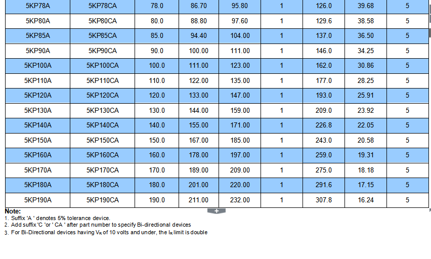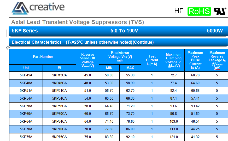 The 5KP Series is specifically designed to protect sensitive electronic equipment from voltage transients caused by lightning and other transient voltage events.
