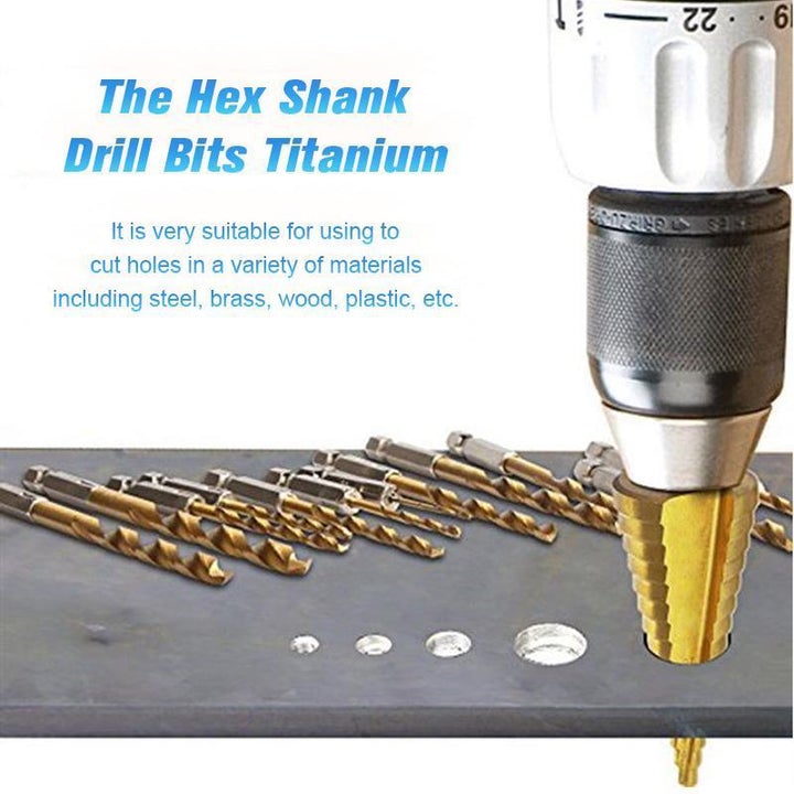 [Package Included] 3-Piece HSS Channel Step Bits (4-12/ 4-20/ 4-32mm). The 1/4" hex shaft driver is suitable for all kinds of household DIY electric drills.
