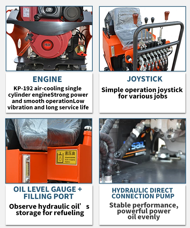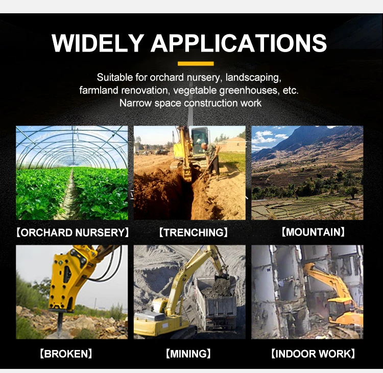 Low fuel consumption, wide scope of operation, suitable for loose land in vegetable shed, landscaping in municipal departments, planting of trees and pits in orchard nurseries, broken concrete pavement, agitation of sand and stone, construction of narrow space, etc., Can equipped with rotary drilling, broken hammer, loading bucket, grab, etc., reduce maintenance and operation costs, liberate labor force, improve mechanization, low investment, high return.