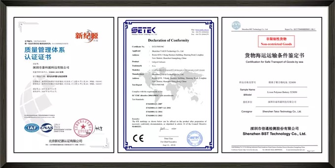 We have strong technical force, well-trained staff, and professional workshops and production equipment. The products are produced in strict accordance with international standards, and have obtained ISO9001, CE, RoHS, UN38.3 and other certificates.