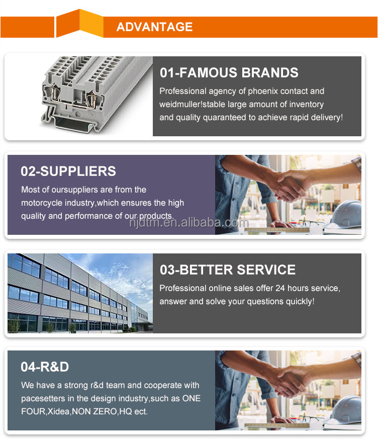 Q1: Are you a trading company or a manufacturer?A1: We are a professional manufacturer with our own independent export right. And we are also senior distributors of Phoenix Contact and Weidmüller!Q2: How about the after-sales service?A1: Our professional online sales will solve all your questions within 24 hours. Of course, if you have any questions after receiving the goods, we will also provide you with suggestions!Q3: How long is your delivery time?A3: We have many products in stock. We can send products in stock within 3 working days. If there is no stock, or insufficient stock, we will check the delivery time with you. Don't worry about everything, here we will do it for you!Q4: What is your shipping method?A4: Usually ship by express -- UPS, DHL, Fedex...or the way you want (by sea or by air)! Don't worry, we'll find the cheapest way for you! If you have a Chinese freight forwarder, we can serve you too!Q5: What kind of payment do you accept? Can I pay in RMB?A5: We accept T/T, Ali payment and Paypal. Please make sure we can receive an invoice for the same amount. And you can pay in RMB, no problem.