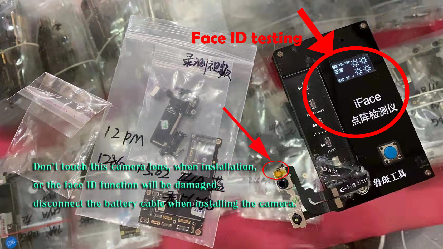 B. For i phone X / XR / XS / XS-Msx / 11 / 11 Pro / 11 Pro Max motherboard with Face ID, please do not touch the camera lens when installing, once you touch it will damage the Face ID function, it will break when installing the camera Unplug the battery cable. Thanks!