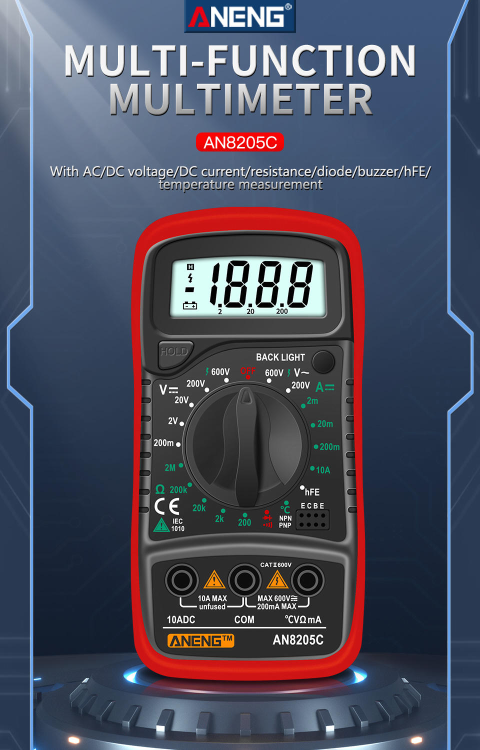 DC current: 2m - 20m - 200m - 10A + 1.8%