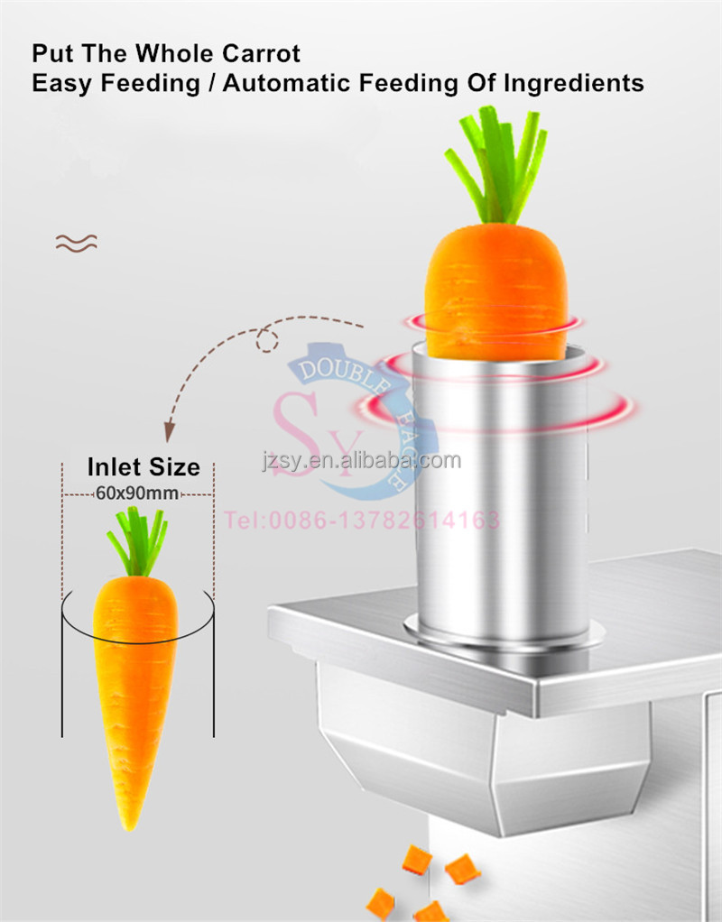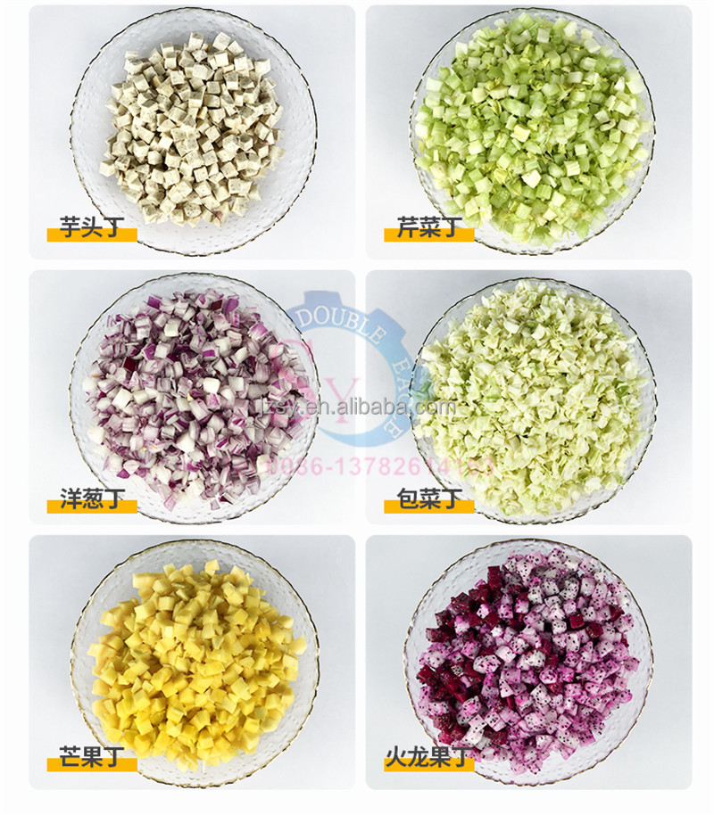 1. Suitable for diced ingredients——, potatoes, radishes, carrots, radishes, lettuce, cucumbers, eggplants, Coprinus comatus, onions, celery, yam beans, green and red peppers, bitter gourd, loofah, lotus root, cabbage, pumpkin, winter melon, cantaloupe , dragon fruit, apple and other common hard and brittle fruits and vegetables (soft foods such as square ham, sandwich ham, smoked tofu, cuttlefish meatballs, etc. can be diced, but some of them will be broken. General fried rice or steamed stuffed bun stuffing has no effect, you can Contact us to send renderings)