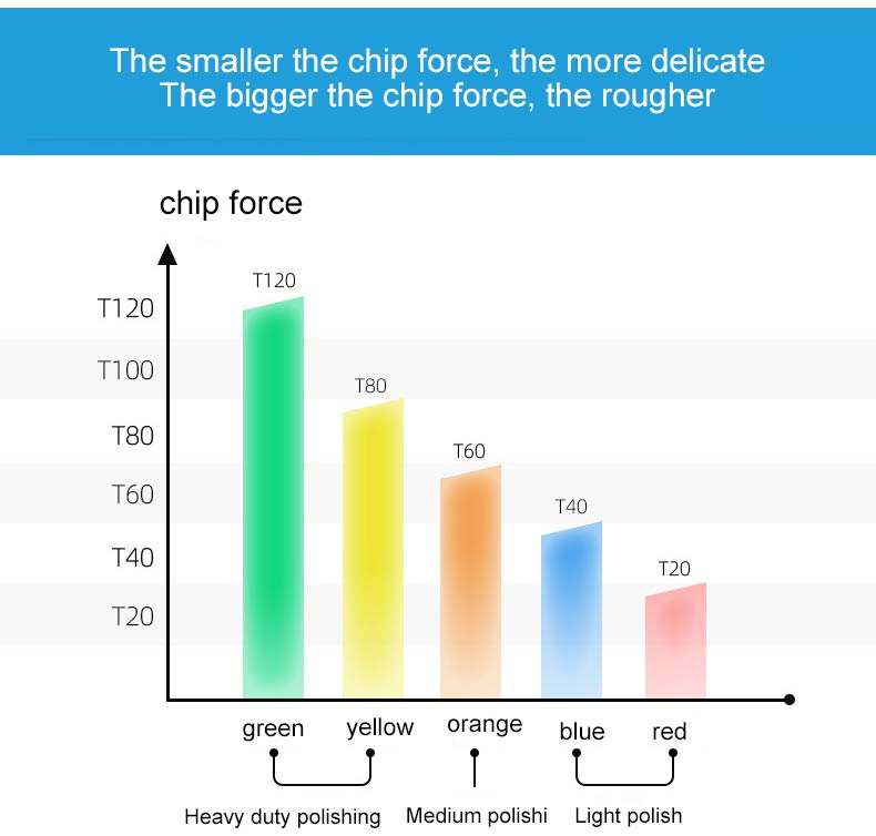 Chip force leveling force moderate hardness, general purpose, can be used for rough, medium and fine polishing. It can effectively remove 1500/2000# sandpaper marks, paint surface spin marks and medium paint surface oxide layer. It is mainly used for conventional paint surface care, and can also be used for post-treatment of paint surface restoration