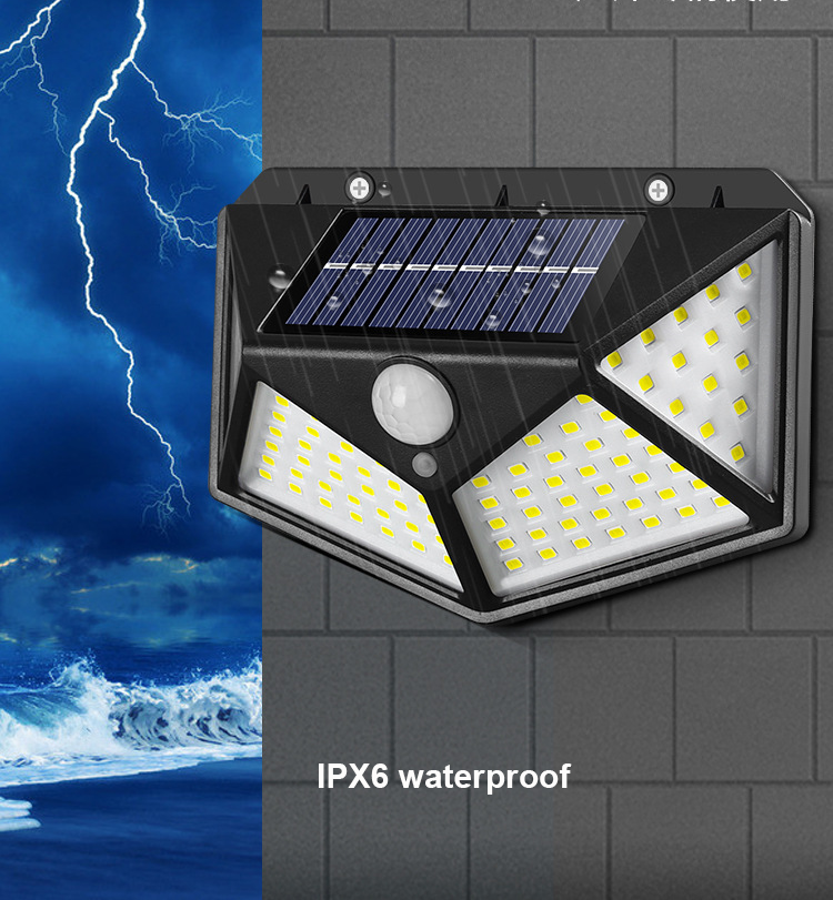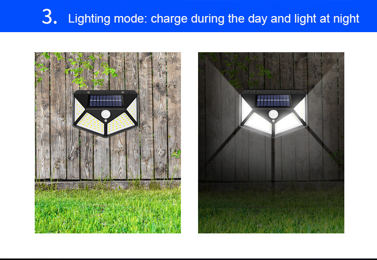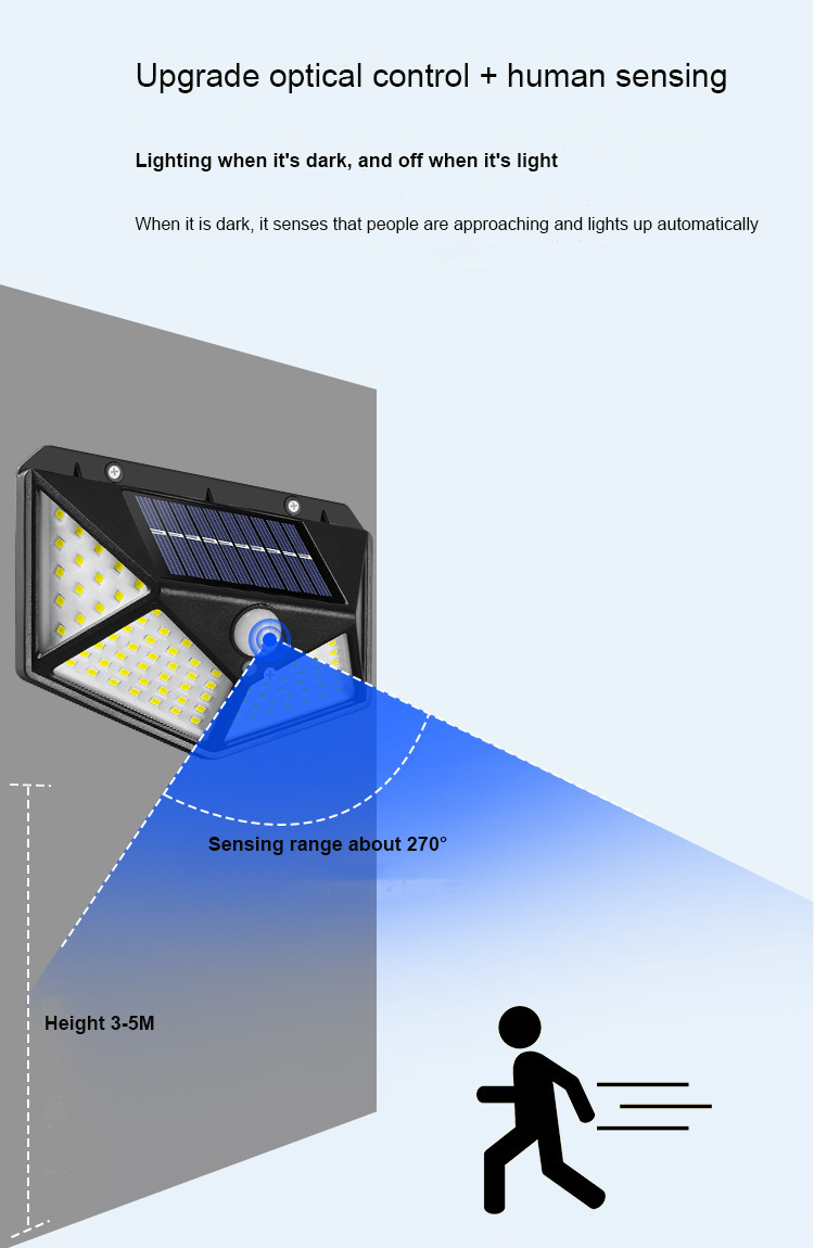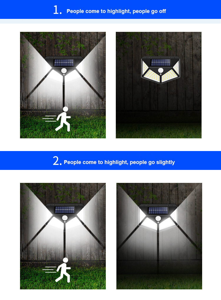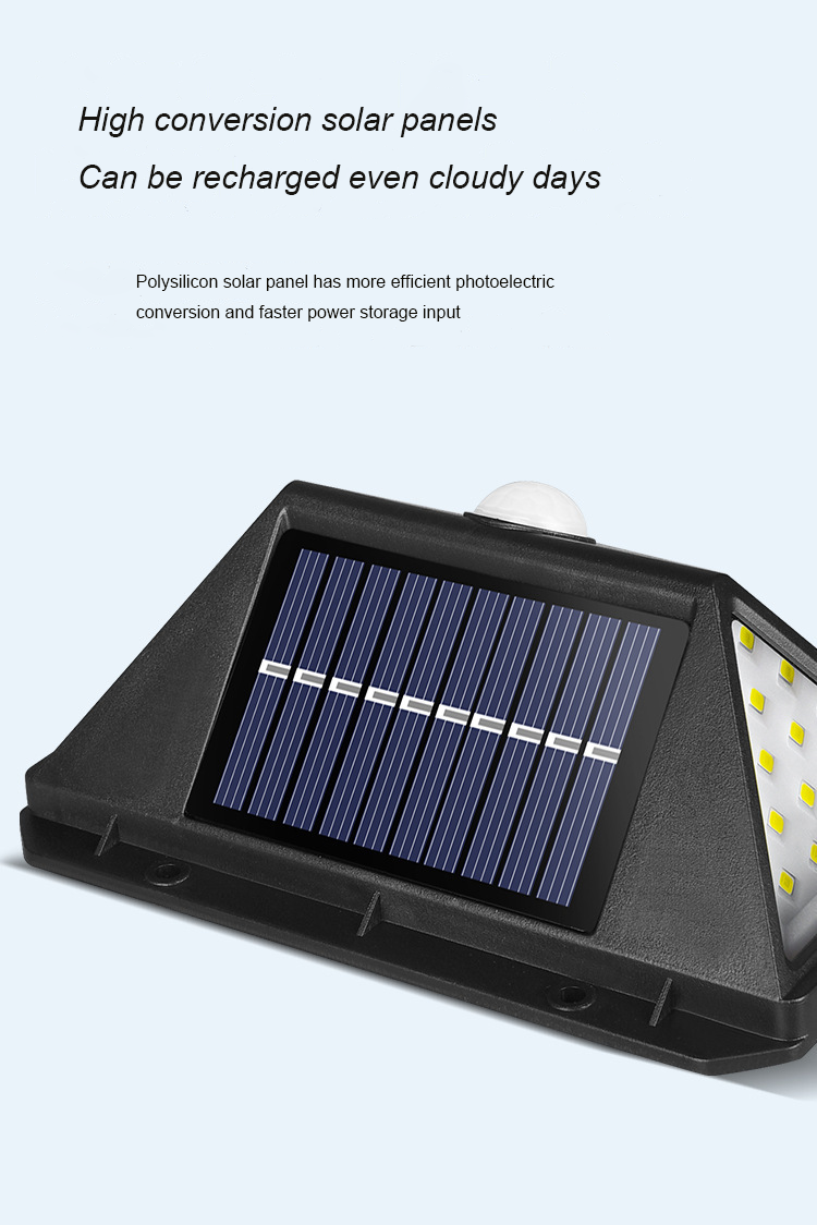 100LED solar waterproof four-sided body sensor wall light switch is set in front of the switch, which is more convenient to operate, and is equipped with indicator light display, energy saving and environmental protection, green lighting, long service life, durable, low failure maintenance rate, high radiation-free stability, and simple installation ( Just use two screws to fix the product on the outdoor wall that can be exposed to sunlight), easy to use, intelligent light sensor control, no need to adjust, energy saving and convenient to make your home more beautiful and smarter.