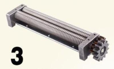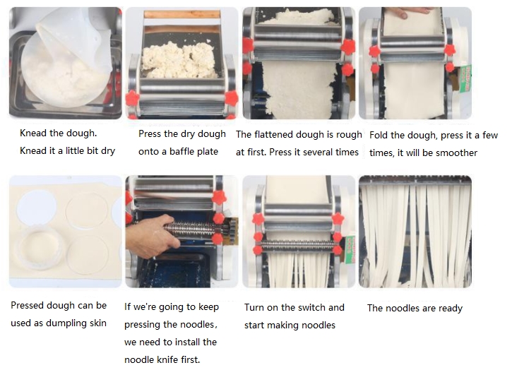 5.Noodle cutting: Install the cutter and adjust the regulator on the cutter as needed. The regulator can be turned clockwise to cut thin noodles, and the regulator can be turned counterclockwise to cut rough noodles. **Put the pressed dough between the noodle buckets Roll out the sides of the noodles until the cutter, which can be cut into thick noodles or thin noodles.