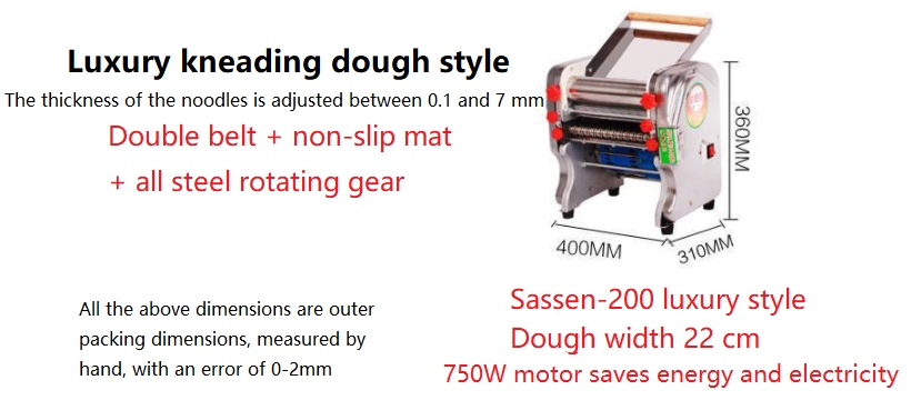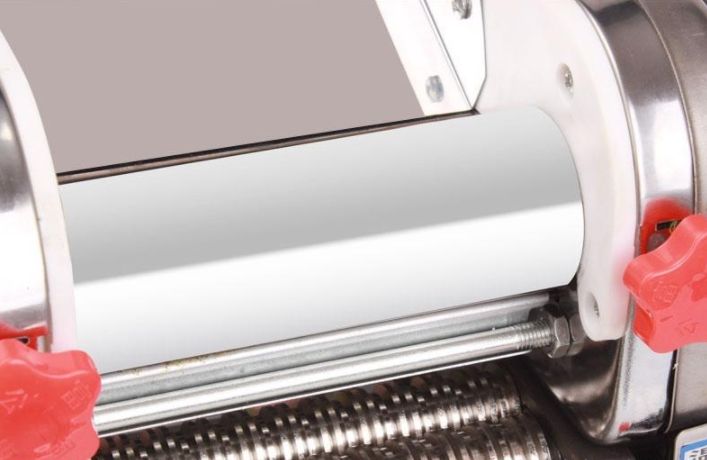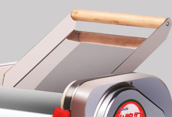 4.Rolling: first remove the cutter, adjust the regulators at both ends of the pressure roller, adjust the gap between the pressure rollers on both sides to 2.5-3mm, iInsert the plug into the 220V power socket, press the switch on the machine, put the prepared noodles into the noodle barrel, introduce them between the noodle rollers, roll them repeatedly 4-5 times, adjust the noodle roller gap to 1.5mm, and press once.