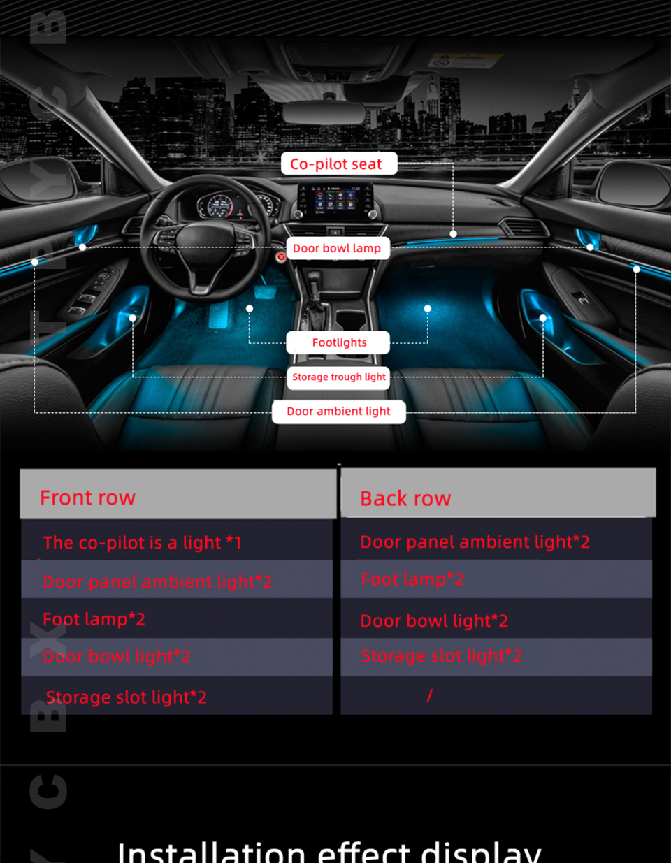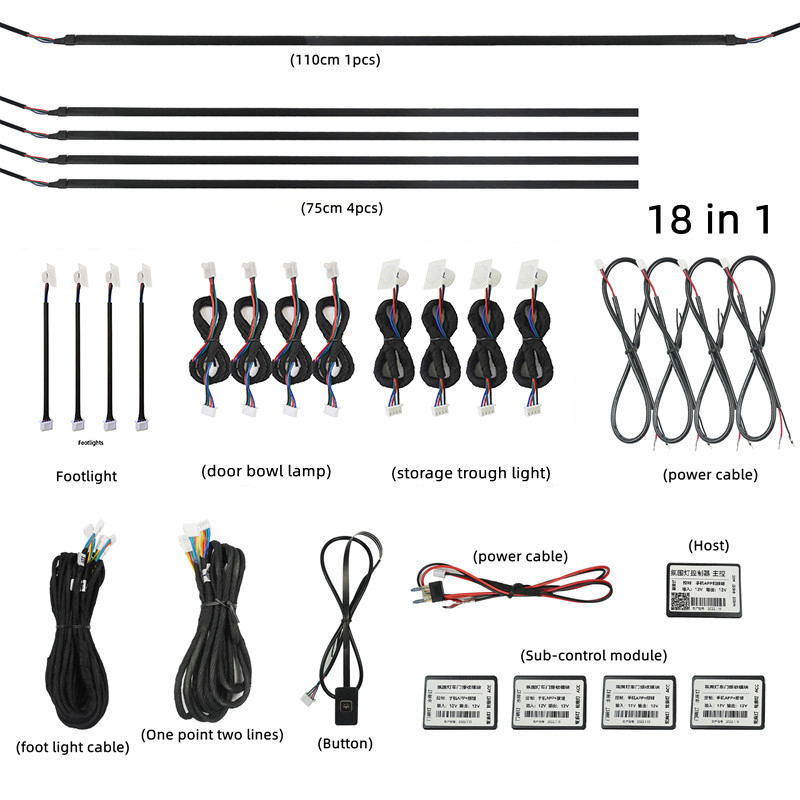 - Commodity type: 18 in 1 (6 LED strips (75cm/4+110cm/1 ) + 4 ambient (foot) lights + 4 door bowl lights + 4 storage lights + 1 main control box + 4 secondary control)