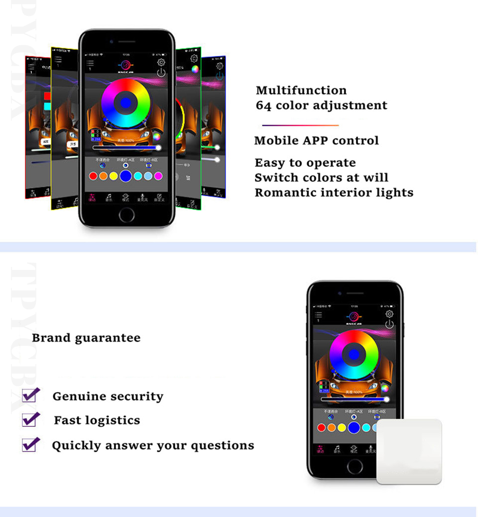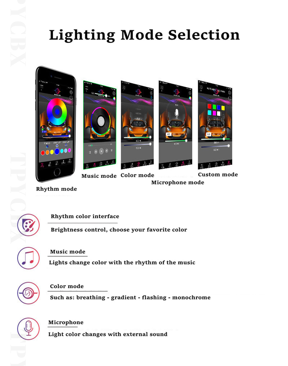 1) Active sound effect: The LED under the car brightness system is equipped with a sound sensor to synchronize the LED light with the rhythm of the music. The LED light and music bar flashes according to the rhythm to adapt to the strength of the sound.