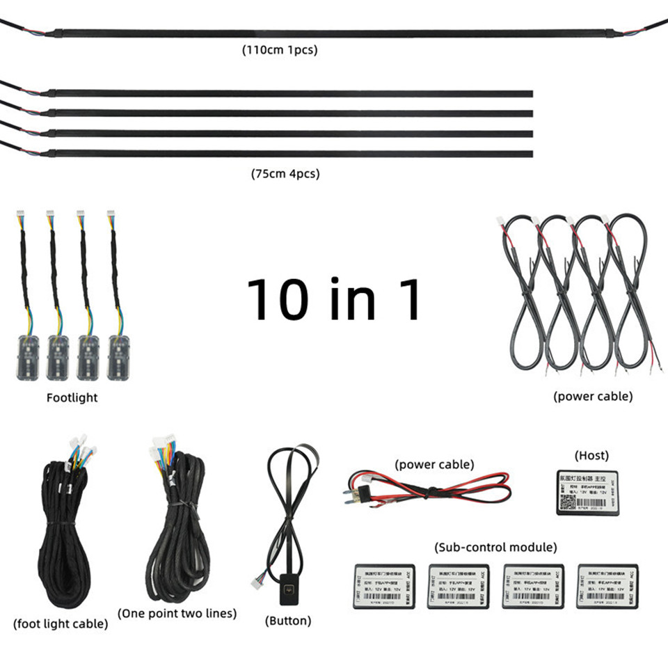 - Commodity type: 10 in 1 (6 LED strips (75cm/4+11cm/1 ) + 4 ambient (foot) lights + 1 main control box + 4 sub-controls)
