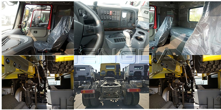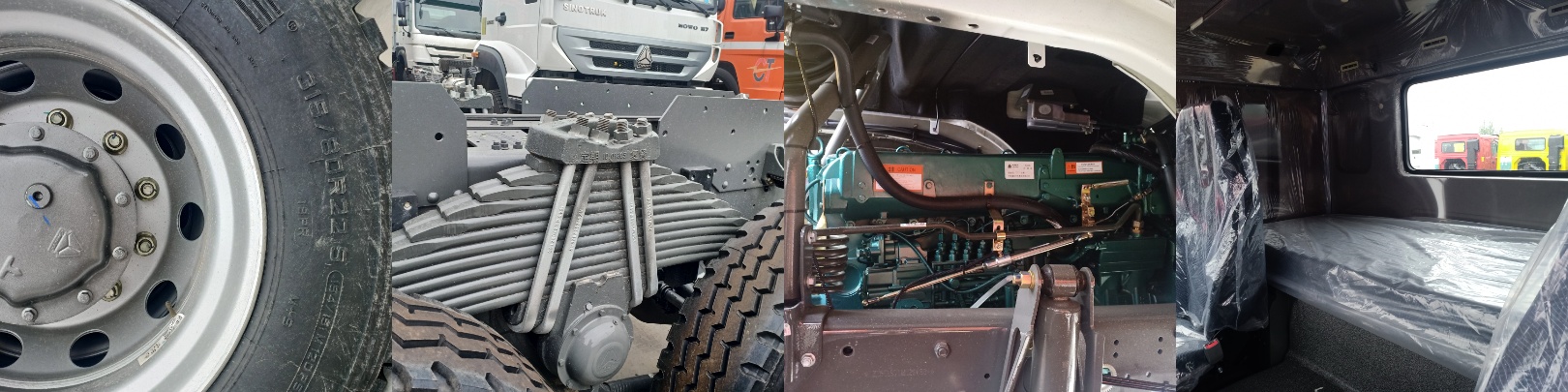 engine | Brand: Sinotruk Diesel engine: four-stroke direct injection diesel engine Engine model: WD615.62, Euro II emission standard 6-cylinder in-line water-cooled, turbocharged, intercooled Maximum output: 266 HP (196KW) at 2600 rpm Maximum torque: 1100 Nm at 1100-1600 rpm Number of cylinders: 6 Displacement: 9.726 liters Aperture: 126mm Stroke: 130mm |