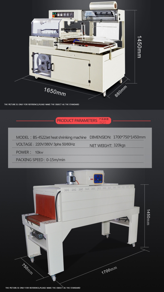 BS-60 series shrink tunnels are used for shrink packaging goods, such as cans, glass bottles, beer, mineral water, etc., wooden, roll