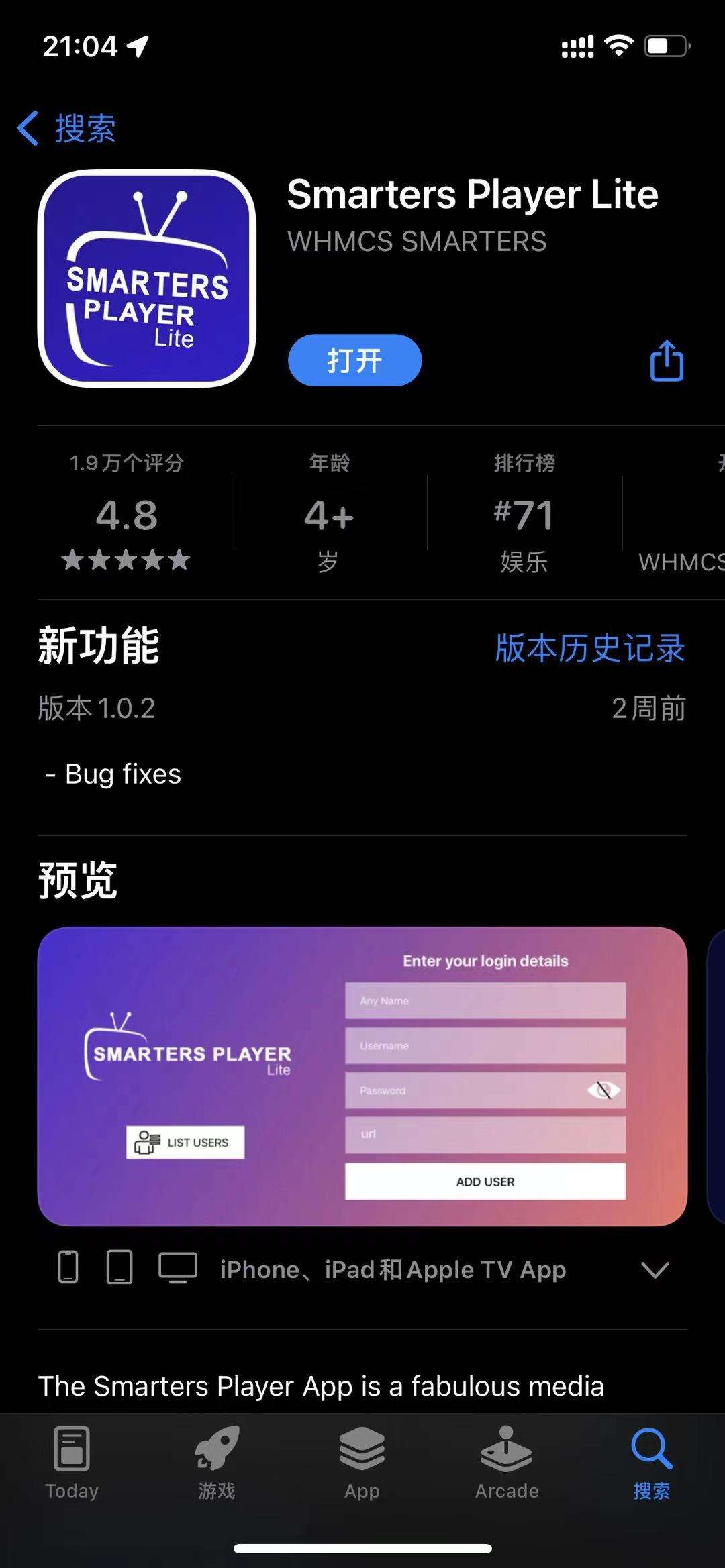 Search for iptv or Smarters Player Lite in the App Store