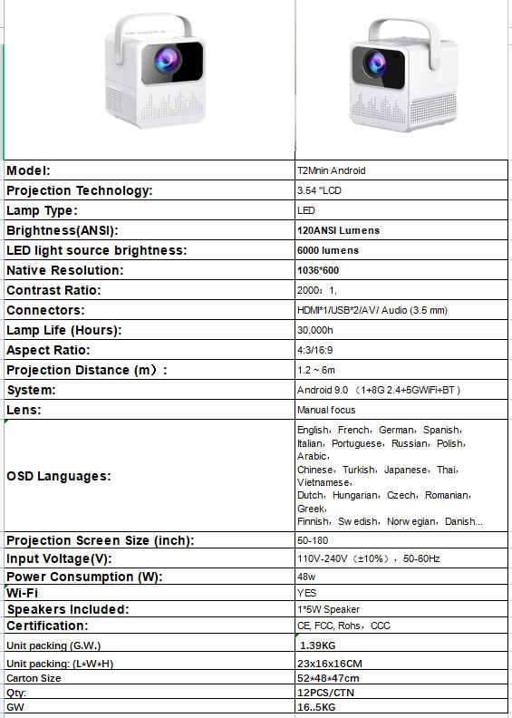 | Native resolution: | 1920*1080P support | model: | T2 Mini |