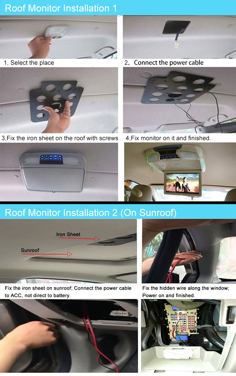 Types of | Flip-down monitors, roof-mounted monitors, in-ceiling monitors | ||||||