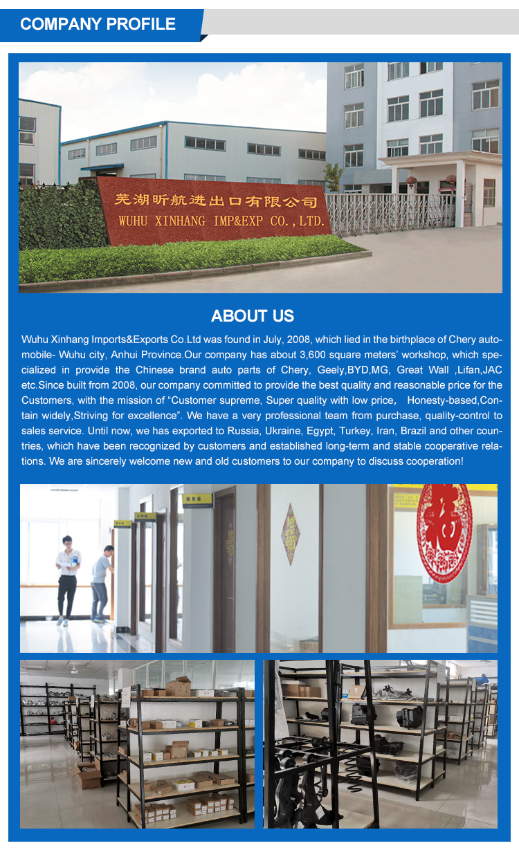 Wuhu Xinhang Import & Export Co., Ltd. was established in July 2008 and is located in Wuhu City, Anhui Province, the birthplace of Chery Automobile. The company has a factory building of about 3,600 square meters and specializes in providing Chinese brand auto parts. Chery, Geely, BYD, Great Wall, etc. Since its establishment in 2008, our company is committed to providing customers with the best quality and reasonable price, with the "customer first, high quality and low price, integrity-based, extensive inclusion, and pursuit of excellence. ” We have a very professional team from purchasing, quality control to sales service. So far, we have exported to Russia, Ukraine, Egypt, Turkey, Iran, Brazil and other countries, which have been recognized by customers and established long-term and stable cooperative relations. We sincerely welcome new and old customers to our company to discuss cooperation!