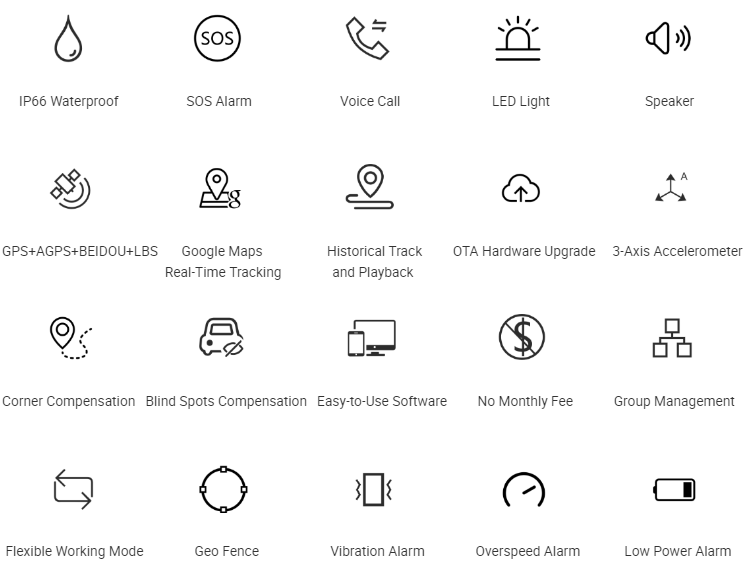 | Features: | Waterproof, shockproof, voice monitoring, street view, speeding warning, wheel track playback, geofence | Packaging Details: | 60 pcs/carton; 56*32*23cm ; 9kg |