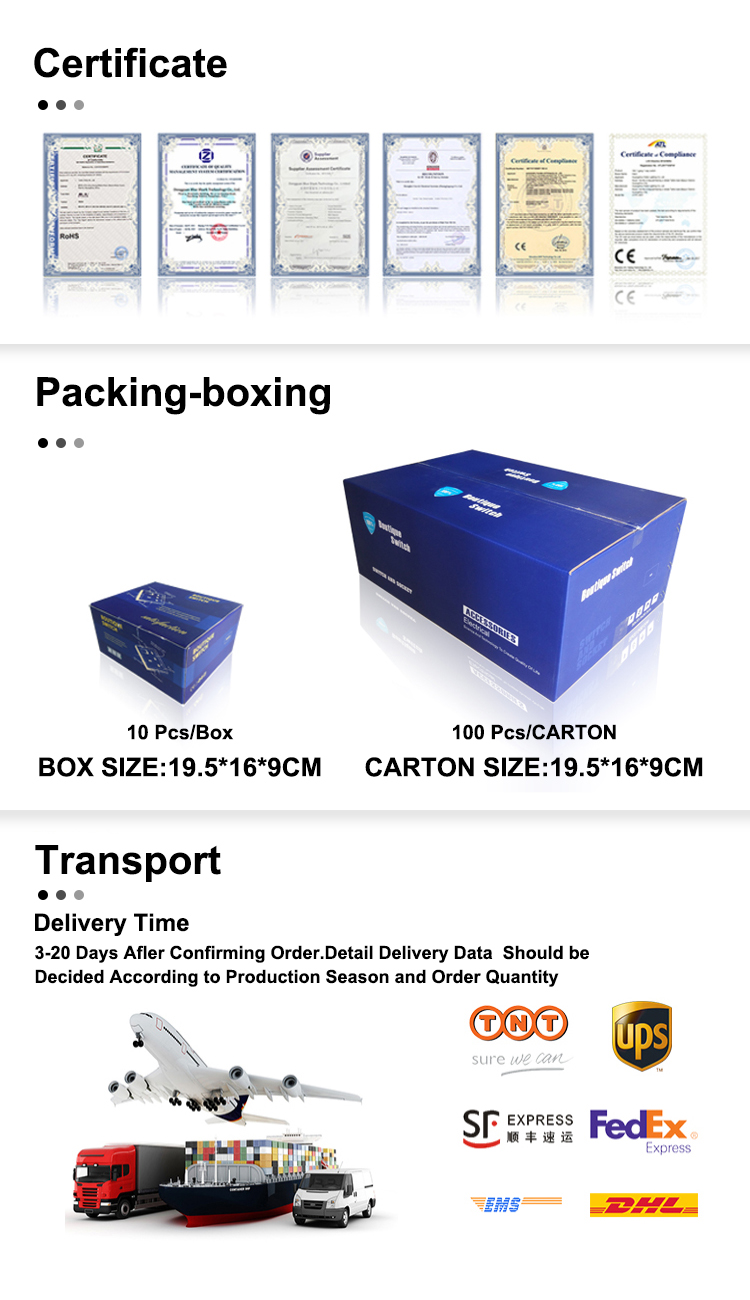 1. How to order? A: Step 1, please tell us what model and quantity you need; Step 2, then we will make PI for you to confirm the order details; Step 3, when we confirm everything, payment can be arranged; Step 4, Finally we ship the goods within the stipulated time. 2. Do you have any MOQ limit for wall switch order? We do not set the minimum order quantity of the product; (for your convenience for sales or your own home use, we do not set the minimum order quantity, you can send us the shopping list you need, we will give you a satisfactory program) 3. Q: When will the delivery be delivered? A: Delivery time-stock order: 1-5 days after receiving full payment-OEM order: 7-20 days after receiving deposit. 4. How to solve the after-sales quality problems? After-sales service All kinds of products are guaranteed for 15 years; If you find any defective accessories for the first time, we will replace you with new accessories for free in the next order, as an experienced manufacturer, you can rest assured of quality and after-sales service. 5. Payment T/T, L/C. 6. Shipping is by DHL, UPS, EMS, Fedex, Air Freight. Ocean Freight. 7. Do you support dropshipping? Yes, you can drop ship. 8. Is it possible to print my logo on the wall switch product? Answer: Yes. Please inform us formally before our production, and confirm the design first according to the mass production after testing the samples If you have any questions, you can contact us!