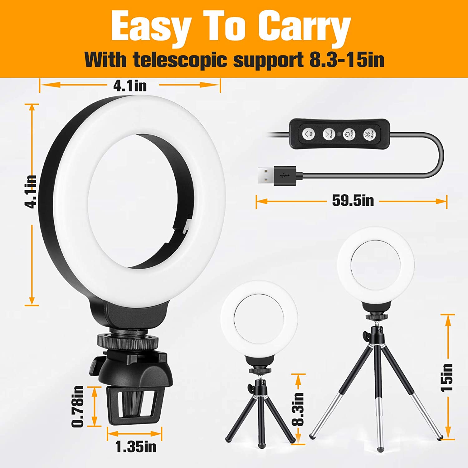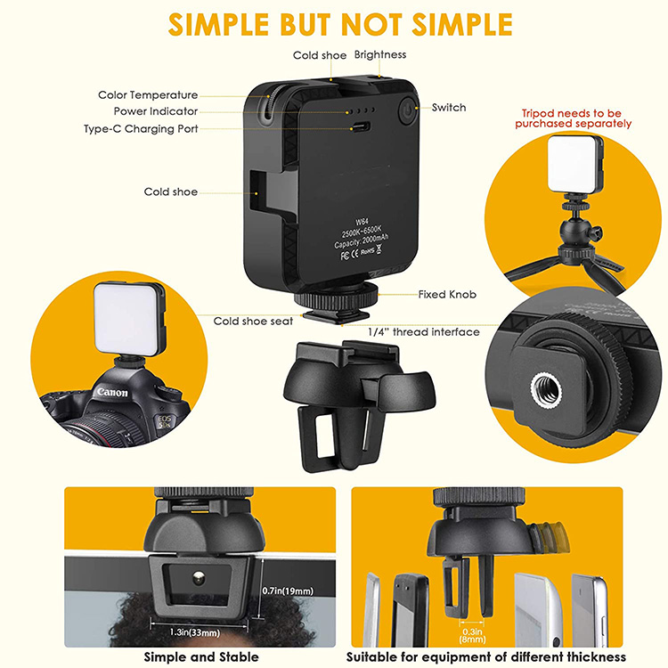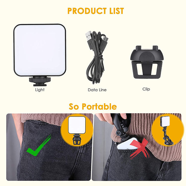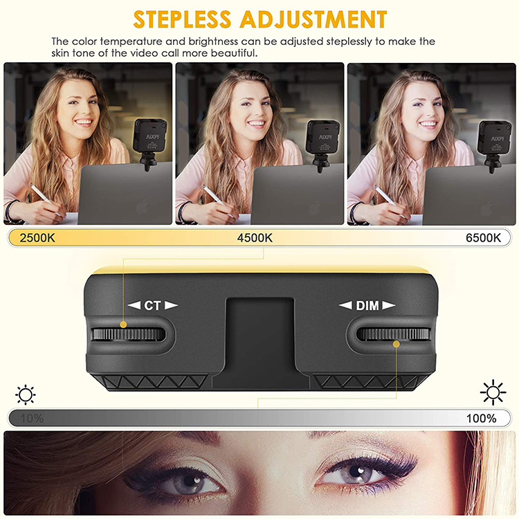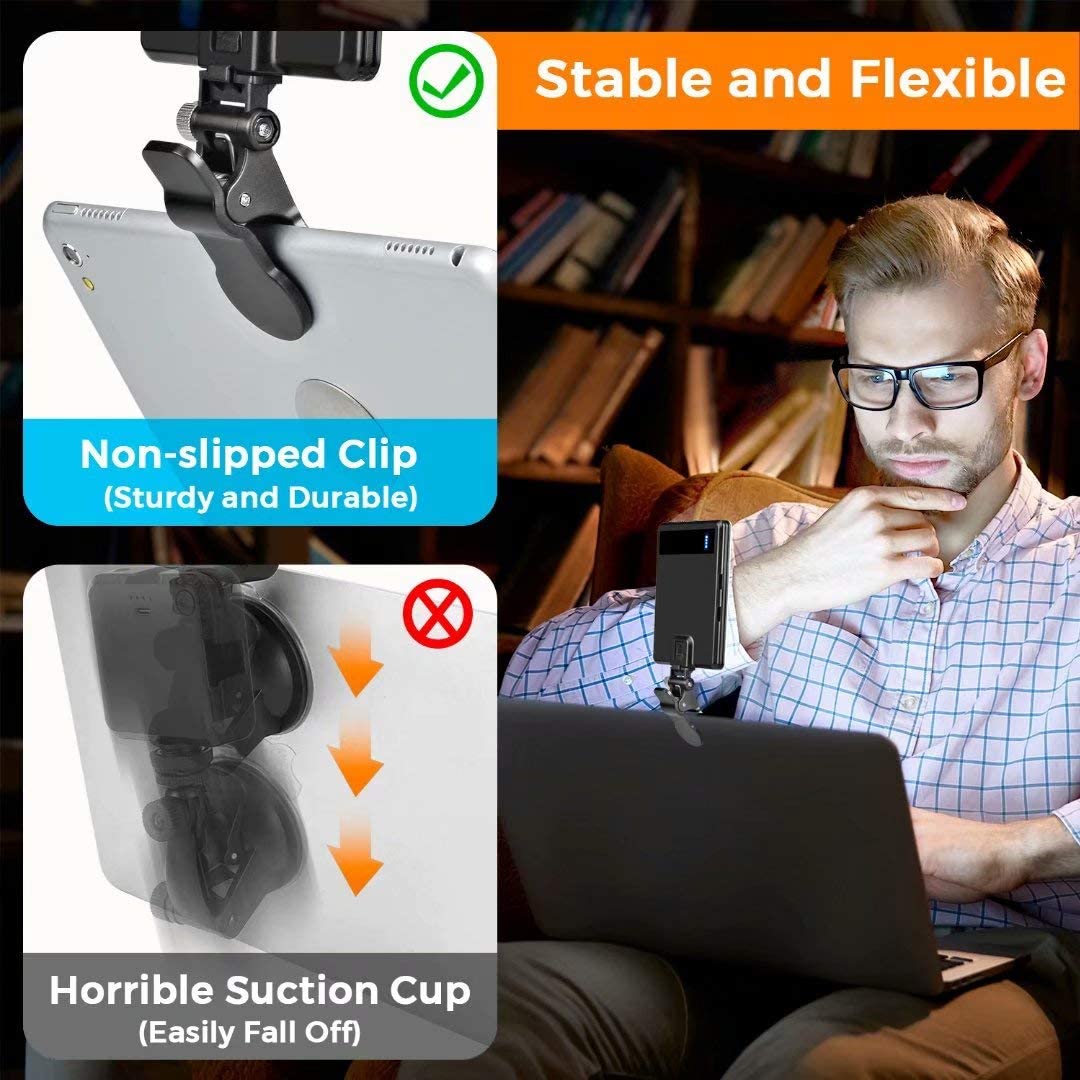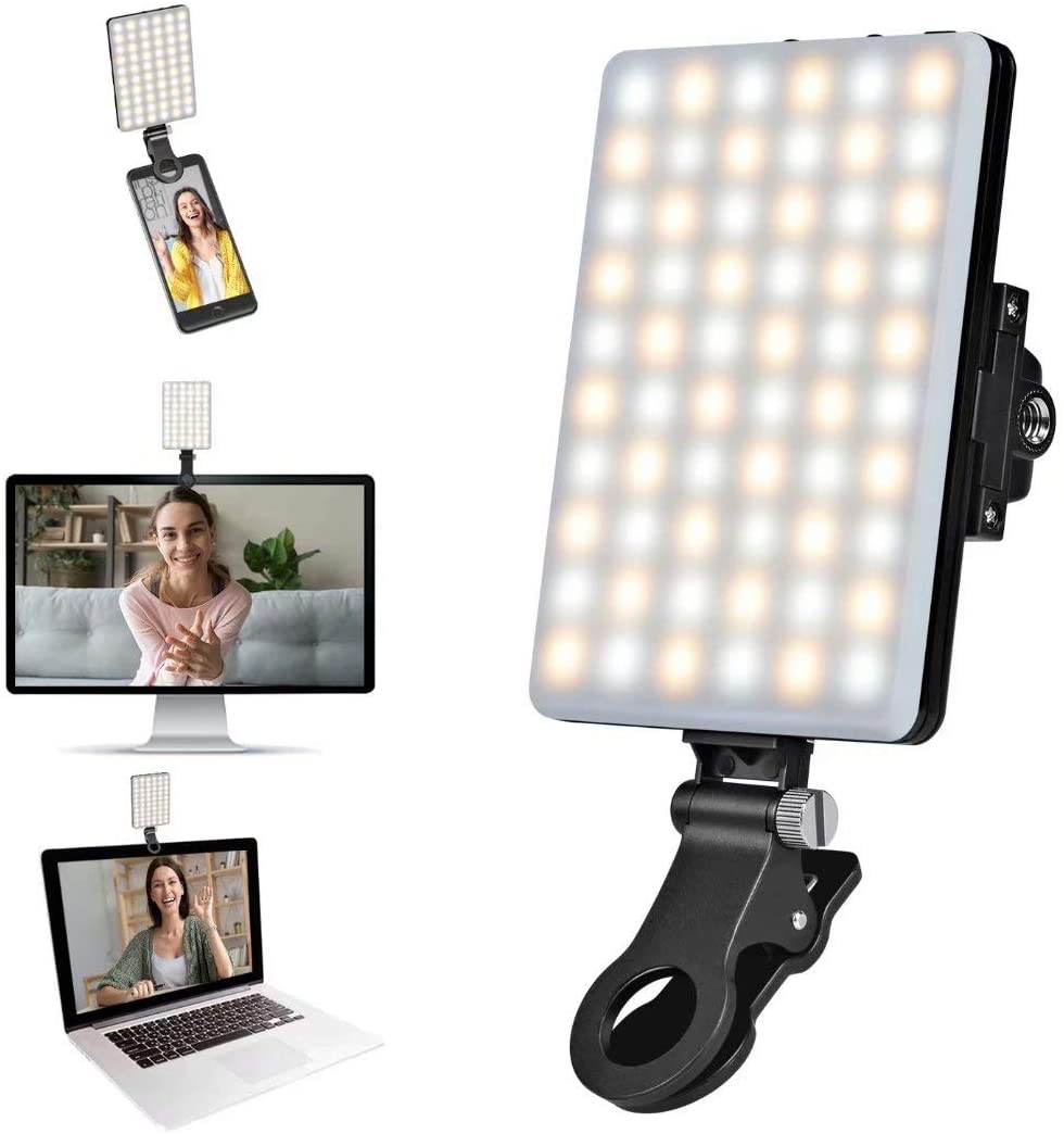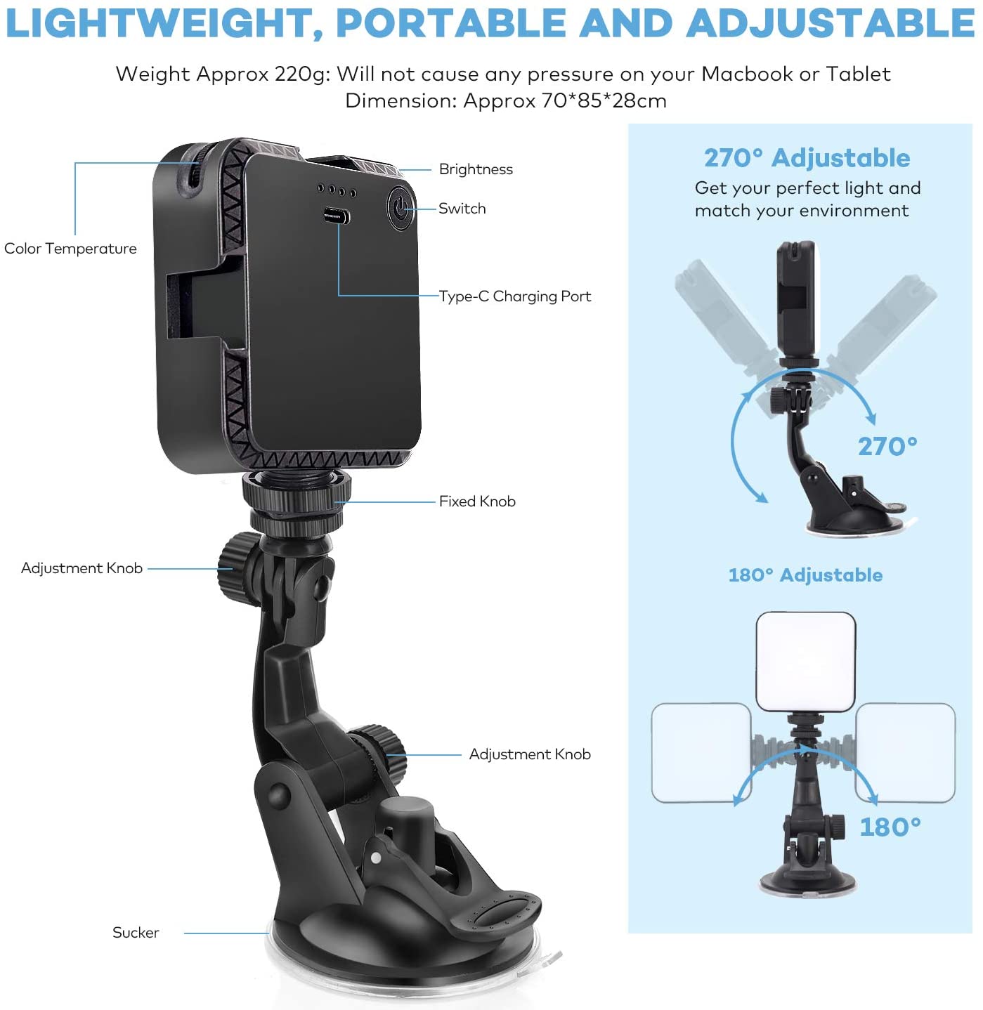 【Sturdy clip, easy to carry】The video conference light kit is equipped with an upgraded strong detachable clip, easy to install and remove, more convenient for daily use than traditional suction cups.【Extremely Bright Video Light】64 LED units equipped with dimmable mode, adjustable video light 10% - 100% brightness, 2500K-6500K color temperature adjustable, get perfect lighting under different conditions.【Universal Compatibility】The camera light is suitable for mobile phones, Macbook, iPad, desktop computers, laptops, tablets (note: width <8mm), widely used in zoom teleconferencing, remote work, video conferencing, photography, makeup vlog production, self-broadcasting, youtube Live streaming and more[1 meter charging cable]Built-in 2000mah rechargeable battery provides 2.5-10 working hours and 1m Type-C charging cable can charge and work at the same time.