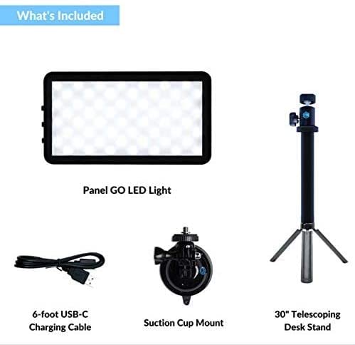 Soft and Clean iPhone Size LED Light: Easy to move for proper brightness in any environment. Adjustable Brightness and Color: Brightness range 1%-100%, adjustable in 5% increments. Color temperature: 3200K (warm) - 5600K (cool)USB-C charging: Built-in lithium-ion battery for extended run time. Run time at 1% brightness: 16 hours. Run time at 50% brightness: 2.3 hours. 100% brightness run time: 1.3 hours12" to 30" adjustable stand: Adjust to the height you need! Whether you're working on your laptop or desktop, our fully adjustable stand can fit your needs.Includes computer stand:Use the included suction cup computer stand with your laptop, desktop or any flat surface!