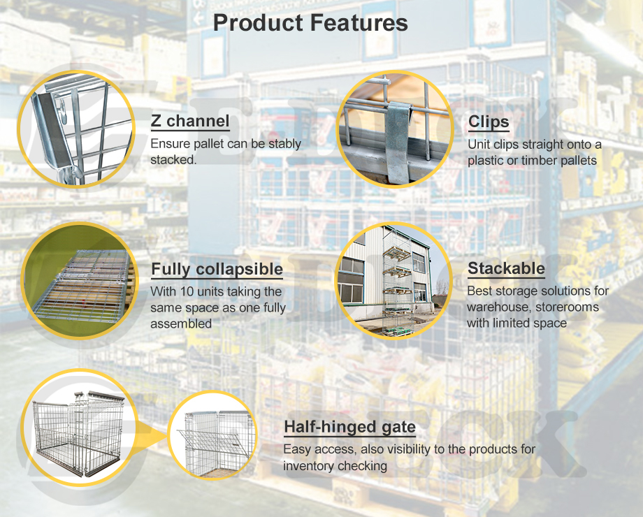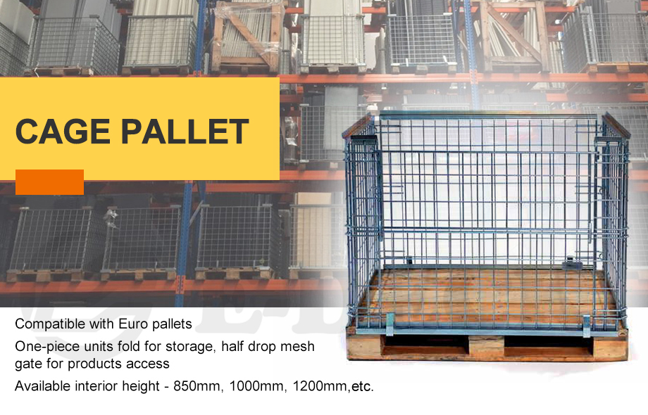 Compatible with Euro-pallets, one-piece unit folds away for storage, half drop net door for product access, available internal heights - 850mm, 1000mm, 1200mm etc.