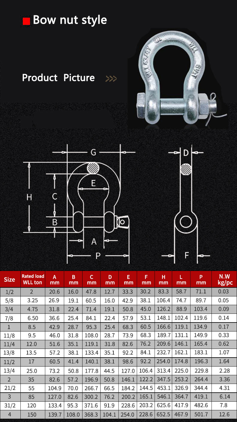 | model: | 0.5T/1T/2T/3.25T/4.75T/6.5T/8.5T/9.5T | Shackle pin type: | Pin with collar, Pin with safety bolt, Pin with square head |