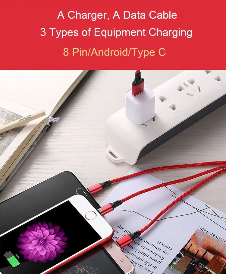 Item | Hengye Multi Head Nylon Braided CE Certified 3in1 Usb Charger Cable For iPhone X Android Type C |