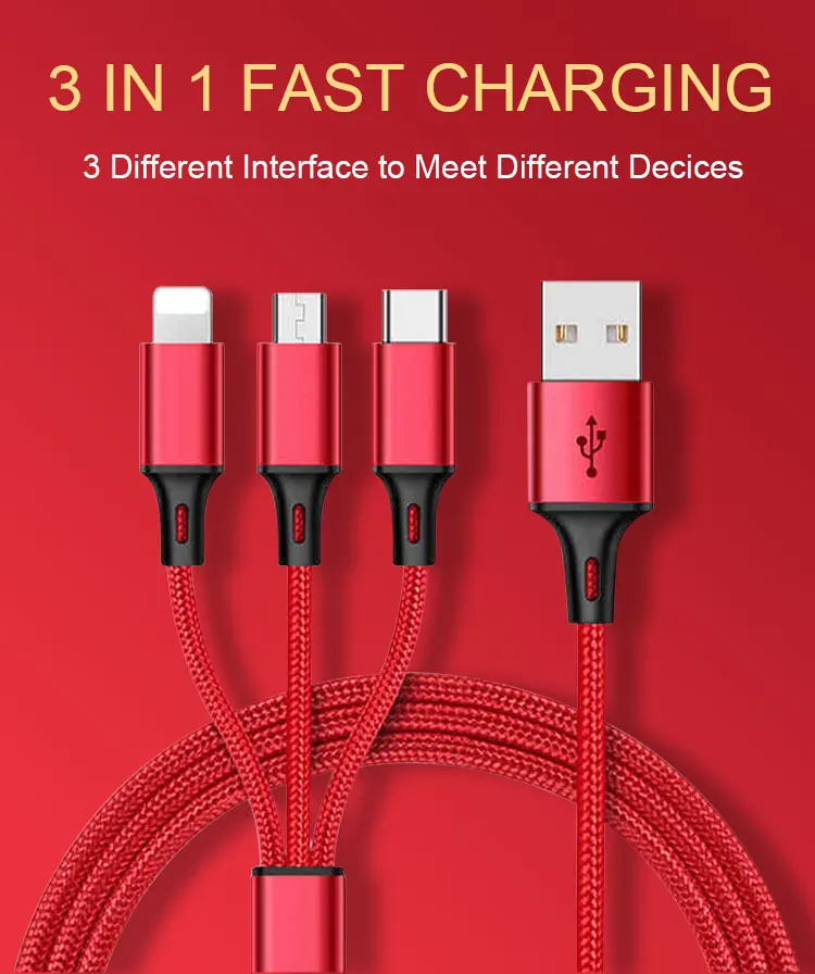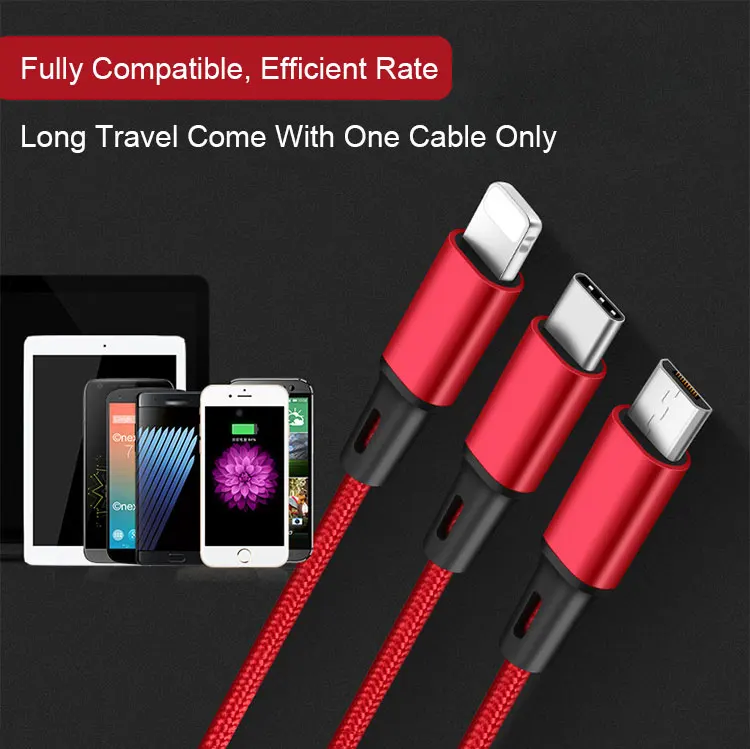 Hengye Multi Head Nylon Braided CE Certified 3in1 Usb Charger Cable For iPhone X Android Type C