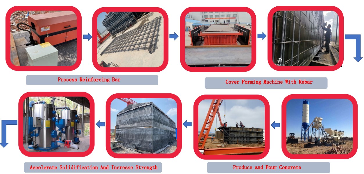 1. Process the steel bars with a CNC steel bar machine, weave the steel bars (reinforced bars) into a grid, and cover the inner chassis of the forming machine.