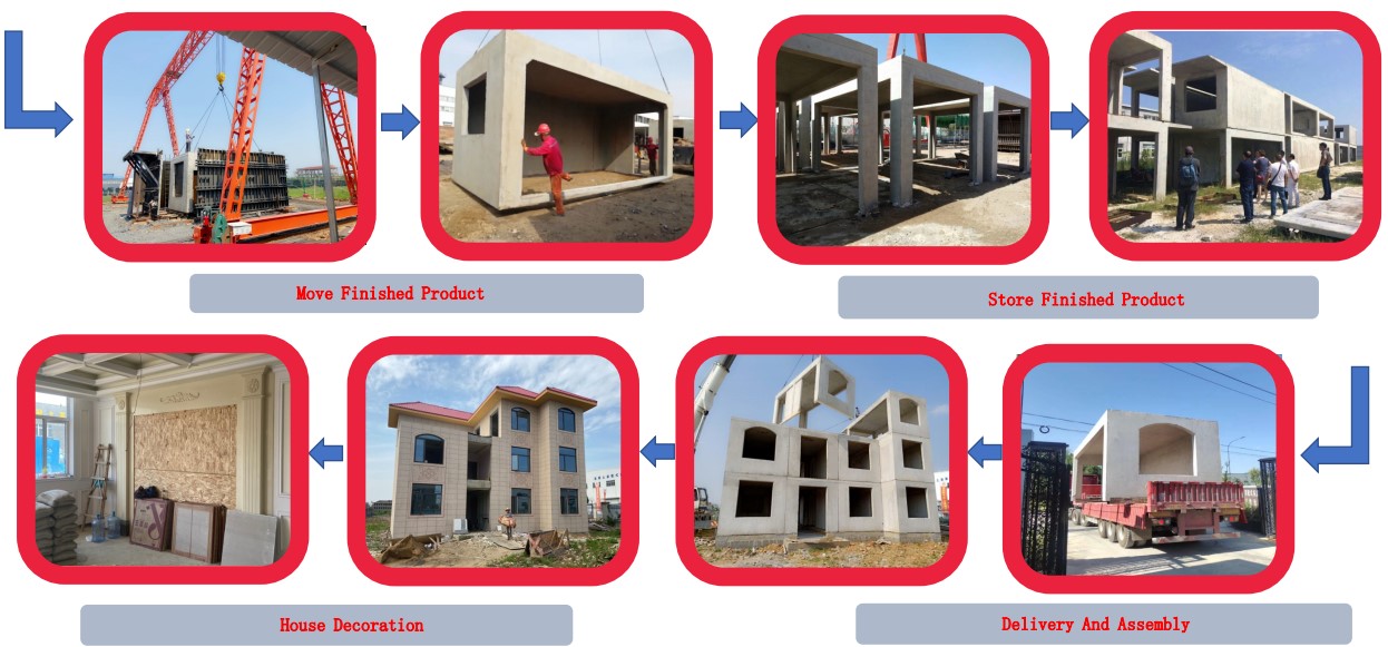 The level of prefabrication is high, the size is accurate, and the construction speed is extremely fast. 500 square meters can be built in one day, which greatly improves the construction speed. Realized the industrial production of concrete houses