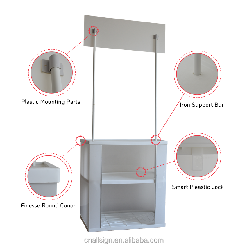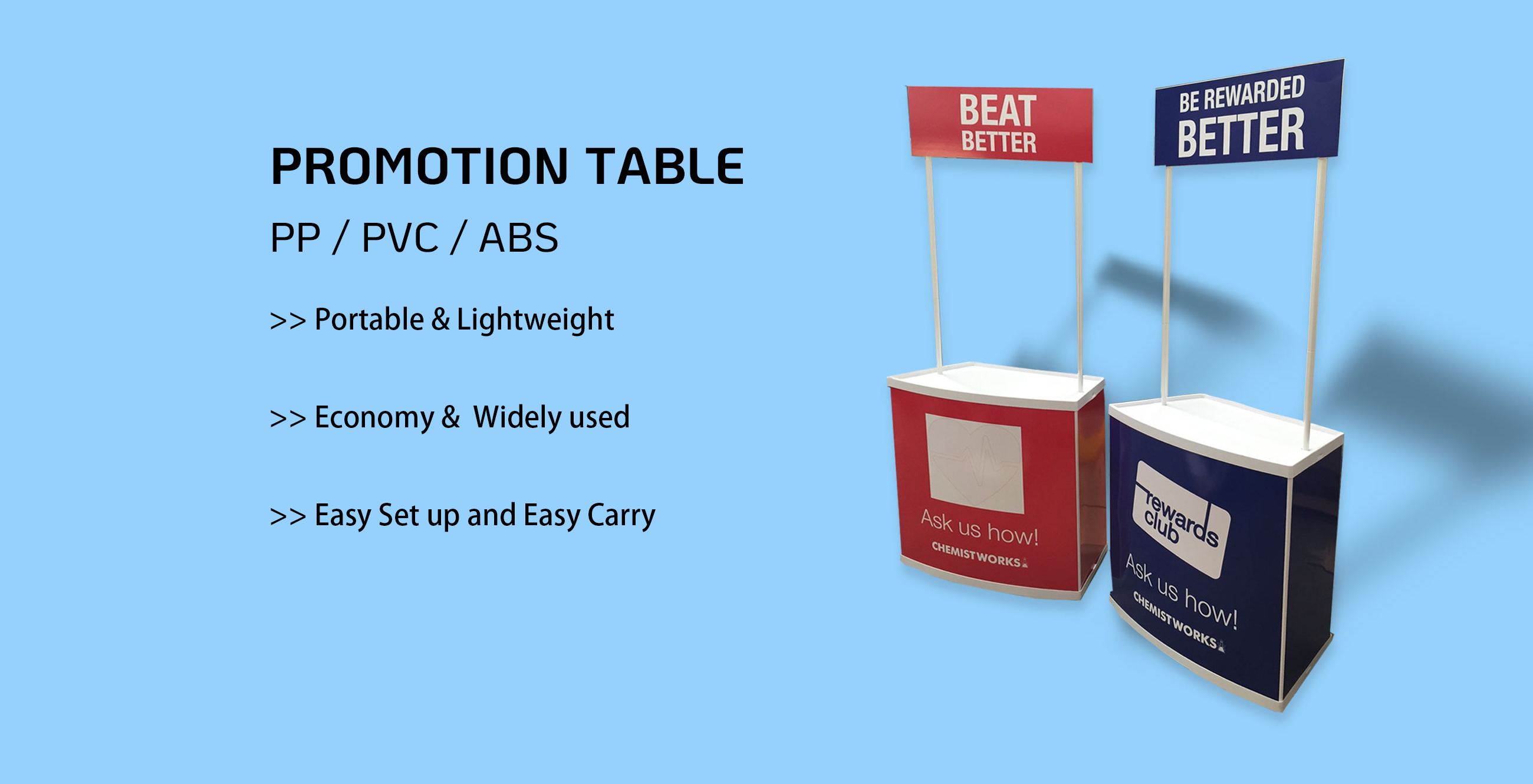 >> There are three kinds of material promotion table for you to choose, PP material promotion table, PVC material promotion table and ABS material promotion table, the most widely used is PP material promotion table.