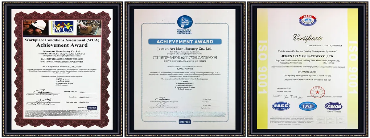 Jebsen Art Manufactory Co.;Ltd., located in Xinhui District, Jiangmen City, Guangdong Province, is a specialized manufacturer of after market car accessories & air freshener.