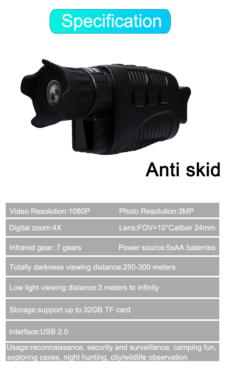 | Action button: | 5 buttons | Additional features: | High-definition infrared, easy to carry, super night vision, day and night use, multi-language selection, two-in-one power supply |