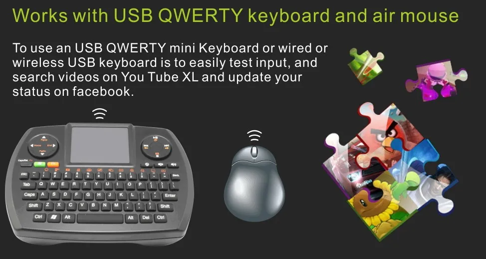 Use the on-screen keyboard or attach your wired or wireless USB keyboard for easy text input. Perfect for searching videos on YouTube or updating your status on Facebook.
